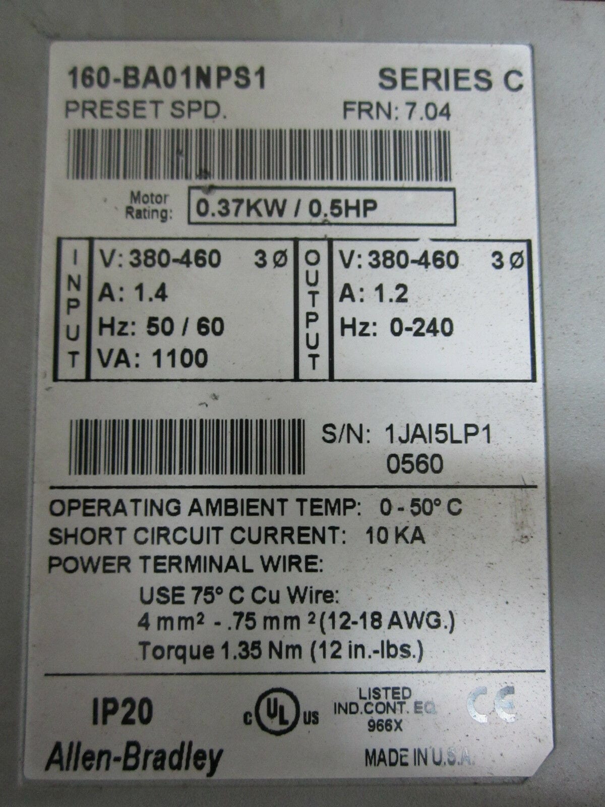 Allen Bradley 160-BA01NPS1 AC Drive Ser C 0.37kW/0.5HP 460VAC FRN 7.04 *Tested