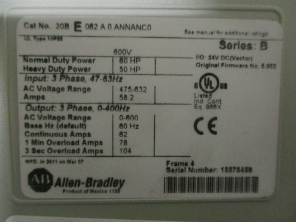 Allen Bradley 20BE062A0ANNANC0 PowerFlex 700 Drive 60HP/50HP 600VAC Series B *Tested*